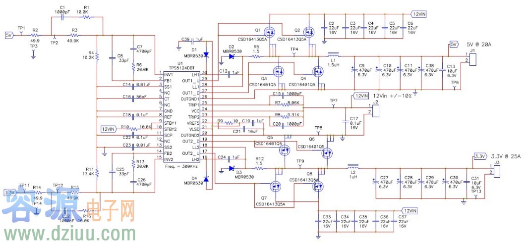 PMP3199 是用于銀盒電源的雙輸出同步降壓設計。銀盒電源用在臺式機中。其輸入電壓為 12V.采用 TPS5124 產(chǎn)生 5V (20A) 和 3.3V (25A) 輸出。該設計具有出色的效率(高達 92%)。主電