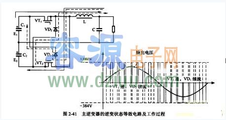 的等效電路及工作過程。我們分析其工作過程時,先按輸出電壓正半周和負半周把它分解為兩個降壓型開關電路(Buck)。在輸出電壓的正半周時,降壓開關電路由開關管VT1、續流二極管VD2和電感「組成。VTI開通時電容C,上的正電壓(384V)通過電感「向負載輸出功率,電感「中的電流線性上升;當VT,由開通轉為截止后,
