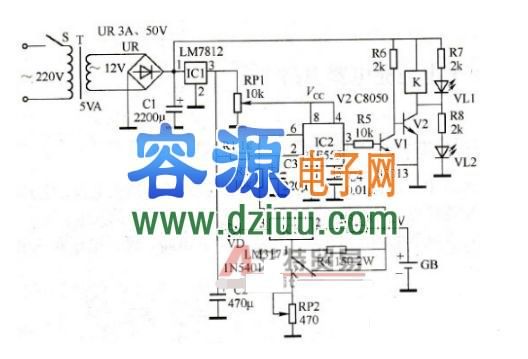 C3兩端電壓不能突變,IC2的2腳電壓低于Vcc/3,IC2內(nèi)部的觸發(fā)器置位,3腳輸出高電平,使V1飽和導(dǎo)通,V2截止,K不能吸合,其常閉觸頭接通,將R4短接,充電電路對電池GB恒流充電。 VL2點(diǎn)亮,指示充電器處于恒流充電