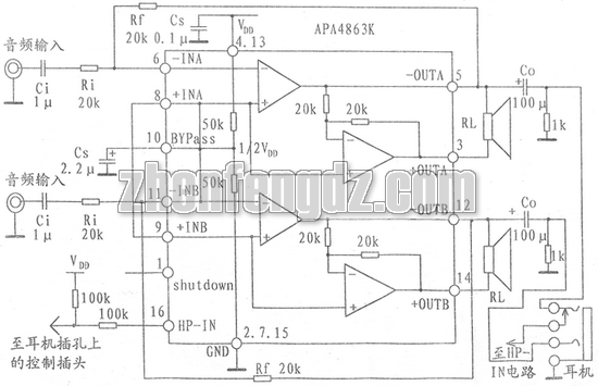 APA4863除內置兩個通道放大電路(A、B)外,還集成有熱關閉電路。APA4863有橋接負載(BTL)或單端(SE)兩種工作模式。其中立體聲BTL模式為揚聲器驅動,SE模式則為立體聲耳機驅動,并且兩種模式可通過輸入控制腳(HP-IN)信號進行轉換。在電源電壓VDD=5V和總諧波失真加噪聲(THD+N)≤1%條件下,對于3Ω、4Ω和8Ω)的BTL負載的輸出功率分別為2.2W、1.8W和1.2W。當APA4863在SE負載下工作時,每個聲道進入32Ω負載中的功率為90mW。對于3.3V的電源電壓和每個聲道4Ω的負載,輸出功率為750mW。