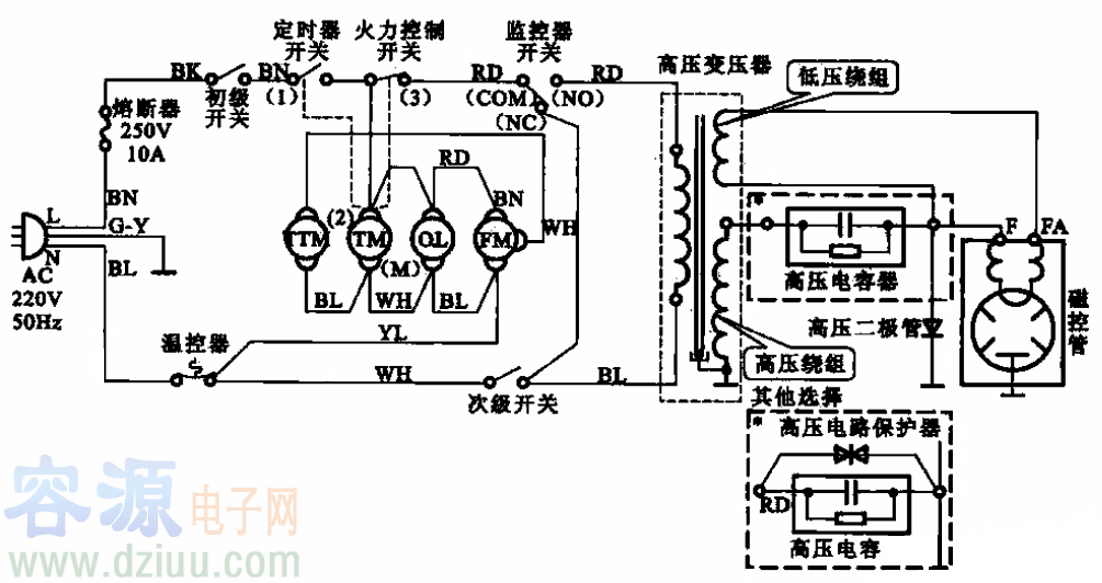 所示為定時器控制式微波爐的工作原理圖。高壓變壓器、高壓整流二極管、高壓電容器和磁控管是微波爐的主要部件。