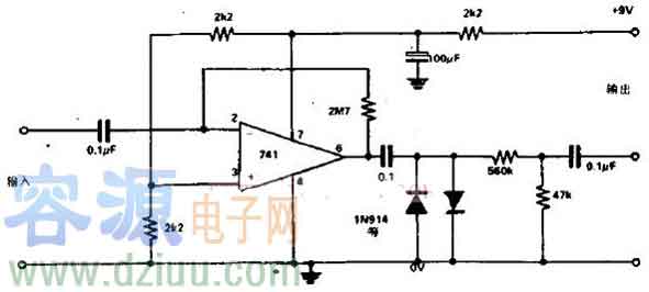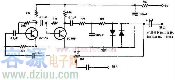 吉他顫滑音箱的電路設計使集成電路的增益達到2700000,為了使輸出的信號失真,這種失真會造成顫滑效果。圖中的兩個二極管將輸出限幅以降低其電平,再經分壓器進一步降低。這一電路的設計最大的優點是維持了原音