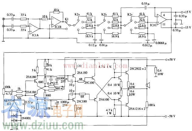 伺服均衡相位、音量控制線路的設計特點是從音源或前級輸出的信號經L,R輸入送到運算放大IC1A的輸入端,開關K1和IC1B就是用來控制信號的正反相,使之與主音箱有更正確的相位匹配。由三聯波段開關K2和IC1C構成的