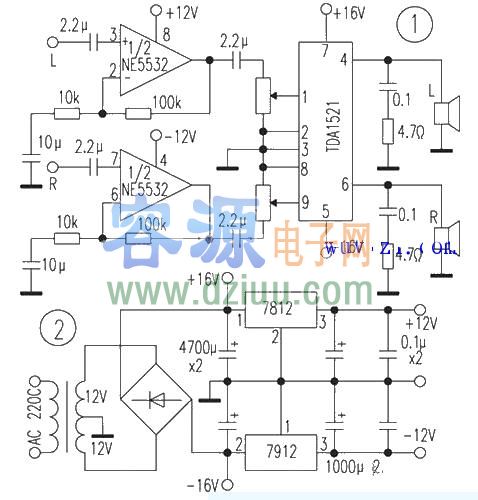 基于TDA1521的立體聲一體化有源音箱電路