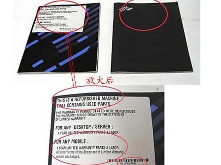 另一個重要標(biāo)識是在說明書上,如圖2所示,在返修筆記本的說明書上,也有類似的標(biāo)注,左邊是返修筆記本電腦的說明書,在封面上有關(guān)于返修的相關(guān)說明,而右邊則是全新筆記本電腦的說明書,封面上沒有這種說明,下面為放大的說明部分,請注意劃圈的幾個地方,上面很清楚的注明了該筆記本內(nèi)含有使用過的零件,并且保修期為1年。另外在筆記本的包裝箱上也有類似標(biāo)注的標(biāo)簽,所以我們在選擇筆記本時也不要忘記檢查這幾個地方,如果發(fā)現(xiàn)了此類標(biāo)簽,即證明該筆記本為返修機(jī)。