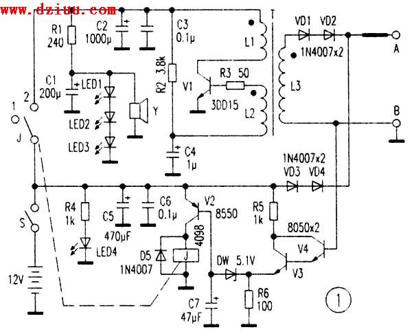 。如接通電源后電路不工作,可改變L2同名端,然后將控制電路接上,用一只100kΩ電阻接于A、B處,接通電源后控制繼電器J如吸合,則訊響器應(yīng)發(fā)出聲音,LED1-LED3應(yīng)發(fā)光。電路調(diào)試完畢 使用。