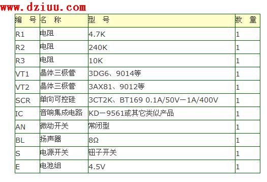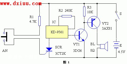 電路原理見圖1(點擊下載原理圖)。SCR、R1和AN組成可控硅觸發(fā)開關(guān)電路;IC1、R2、VT1、VT2和BL組成模擬警笛聲電路。平時,AN受到家用電器的壓迫,使其兩常閉觸點斷開,SCR無觸發(fā)信號而阻斷,報警器不工作。當(dāng)家用電器被搬起時,AN兩觸點自動閉合,SCR的觸發(fā)端經(jīng)R1從電源正極獲得觸發(fā)信號,SCR導(dǎo)通,IC1通電工作,其輸出端輸出的警笛聲電信號經(jīng)VT1、VT2功率放大,推動揚聲器發(fā)出宏亮的報警聲。 ,即使將家電放回原處或破壞掉AN,也無法阻止報警聲。只有主人打開與報警器安裝在一起且其他人一時很難找到的開關(guān)S,才能解除報警。
