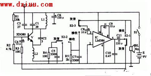 。三極管V和電感線圈L1、電容器C1、C2等組成電容三點(diǎn)式振蕩電路,產(chǎn)生頻率約為100MHz的載頻信號(hào)。集成功放電路LM386和電容器C8、C9、C10、Cll等組成低頻放大電路。揚(yáng)聲器BL
