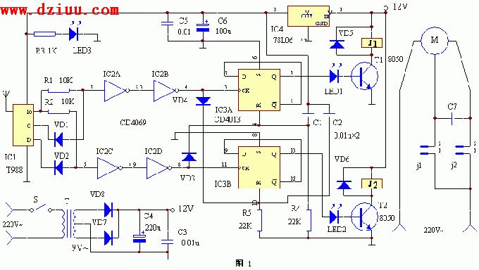 IC1的C端輸出高電平,發VD1截止,Io端輸出的高電平經IC2A、IC2B整形送入IC3A的CK(③腳)端,使Q(①腳)翻轉輸出高電平,T1導通,J1吸合,電機正轉,窗簾合上。若再次按動發射鍵C,則Q(①腳)再次翻轉輸出低電平,J1釋放,窗簾停止運動。若在電機正轉窗簾合上過程中,按動發射鍵D,同樣VD2截止,Io端輸出的高電平經IC2C、IC2D整形送入IC3B的CK(11腳)端,并通過VD3使IC3A的R端呈現高電平,IC3A被強制復位,J1釋放。 Q(13腳)翻轉輸出高電平,T2導通,J2吸合,電機反轉,窗簾打開。同樣再次按動D鍵,Q(11腳)再次翻轉輸出低電平,窗簾停止運動。如此通過兩鍵可任意實現窗簾的打開、合上、停止,非常方便。