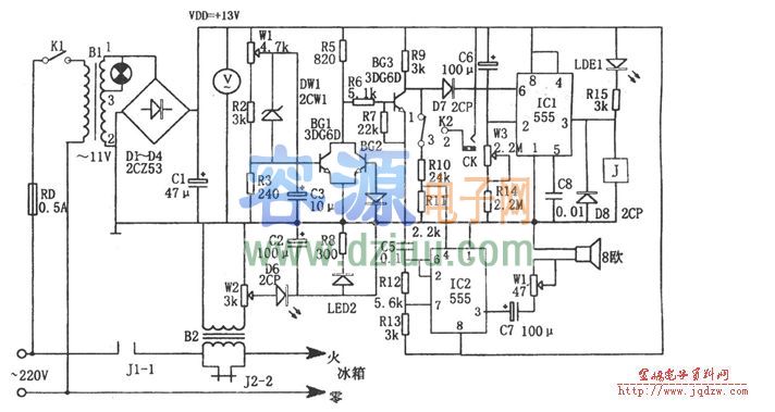 為多功能電冰箱控制電路。該控制器由過壓、欠壓采樣電路、延時啟動電路、聲光報警電路、降壓整流電路等組成。其中降壓整流 電路為整個控制器提供直流電壓。《版權聲明:本文由容源電子網(www_dziuu_com)整理提供,部分內容來源于網絡,如有侵犯到你的權利請與我們聯系更正。》