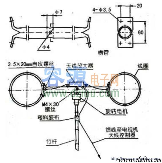 二、組裝兩只線圈,用8注:圖中尺寸單位為mm只M3.5mm×20mm的自攻螺絲固定在橫管兩端,然后再用兩只M3.5mm×20mm的自攻螺絲將天線放大器固定在橫管 的上部,將電視機專用的旋轉電機用M4×30mm螺絲固定在橫管的