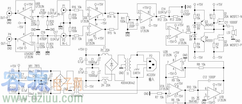 LF353的應用電路圖之D類低音功放