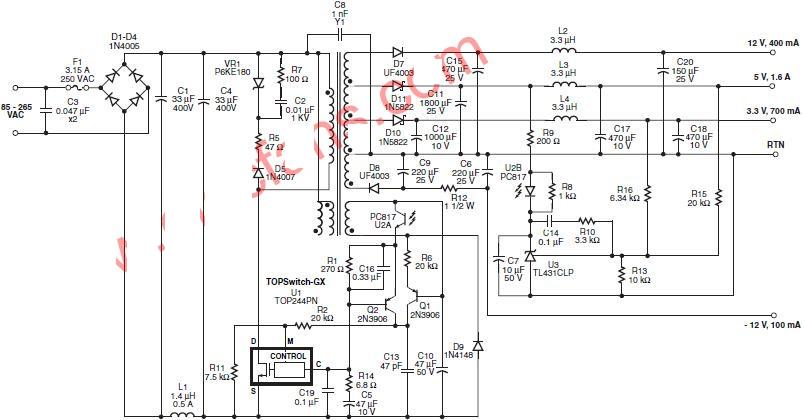 TOPSwitch-GX用電流模式反饋來取得極低的空載功耗。C16、R1和Q2給TOPSwitch-GX的控制腳提供一個恒定的電流。R2把Q2的剩余電流饋入M腳,饋入電流 會降低TOPSwitch-GX的電流限流點。R11設置器件的最大電流點。R6、Q1和C13完成斜坡補償。電源在重載和中等負載時工作在全頻,在輕載時降低開關頻率。D9和C10整流、濾波偏置電壓。TOPSwitch-GX頻率抖動功能可在未使用共模電感的