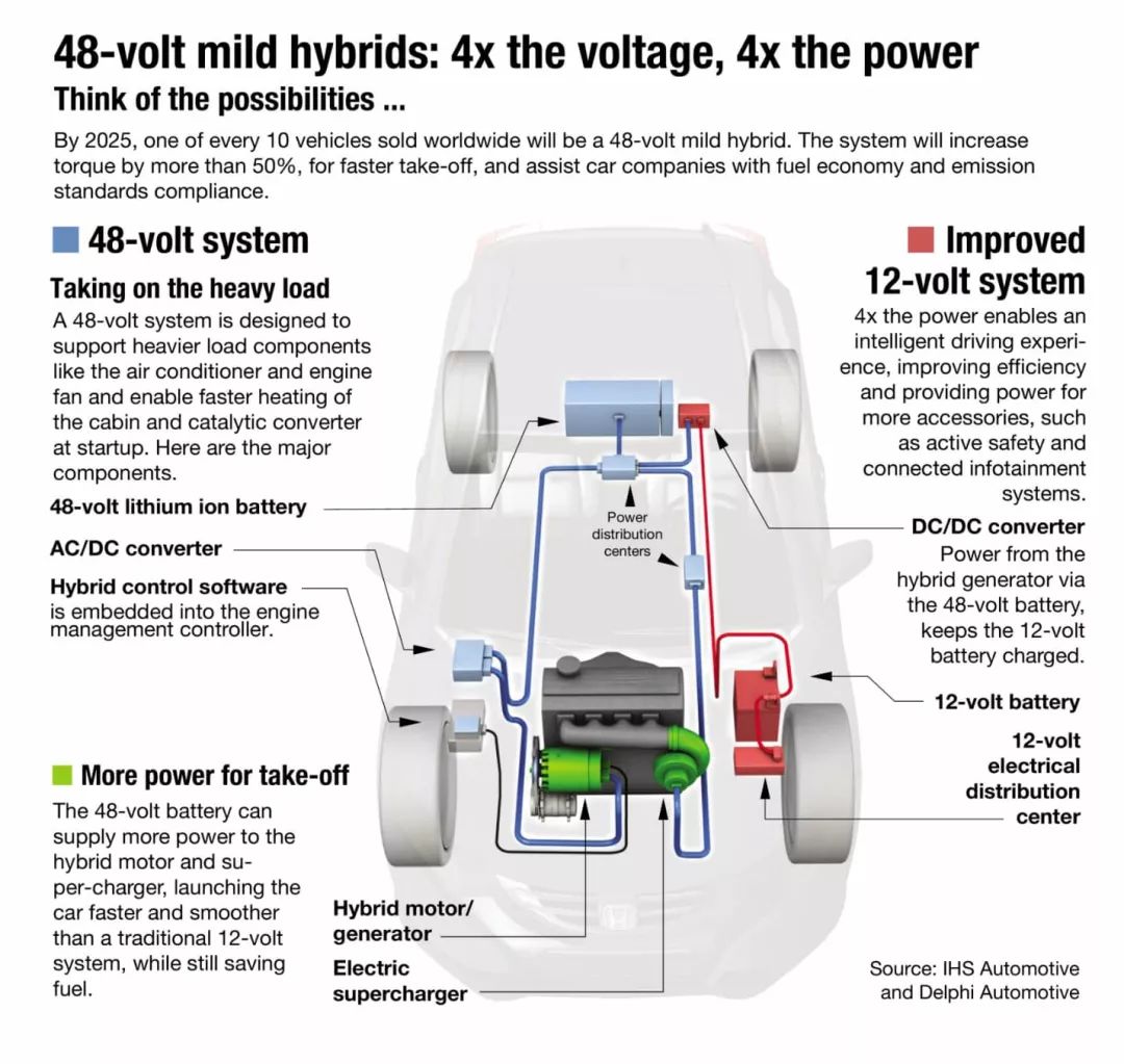 考慮一個基本組件:發動起啟動器,48V電池如何改變發動機啟動器的基本架構,從而更好的增強啟停效果,這種方式有利于減少在紅綠燈和停車等待時的燃油消耗,進一步增強燃油效率。在大多數只有12V電池的汽車中電池為啟動器提供動力,交流發電機作為充電器,然而48V和12V的組合使用可以提供高達10KW的功率,啟動電機和獨立的交流發電機被集成的啟動發電機(ISG)或帶式啟動發電機所取代,48V鋰離子電池和雙向DC/DC轉換器會被封裝在堅固的盒子內,這其實是一種弱混動力系統,與內燃機協同工作。它可以提供三分之二的好處,但是只有三分之一的成本,而經濟效益增加了15%到20%。