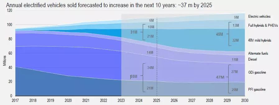 圖1:電動汽車市場(包括純電動汽車和混動汽車)預計在未來幾年會迅速增長,48V的采用將成為有利于增長的一個要素(:Delphi科技)