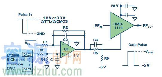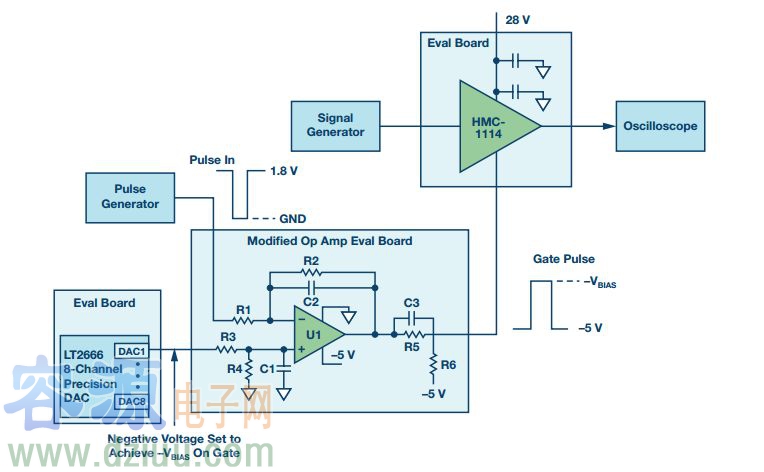 用于驗證電路的測試設置如圖3所示。對精密DAC、運算放大器和HPA使用評估板。一個脈沖發生器用于模擬1.8 V邏輯信號。信號發生器連續工作,利用一個輸入帶寬高于RF頻率的RF采樣示波器測量HPA對RF信號的開啟/關閉。