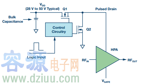 通過漏極控制開關HPA的典型配置如圖1所示。一個串聯FET開啟輸入HPA的高電壓。控制電路需要將邏輯電平脈沖轉換為更高電壓以使串聯FET導通。