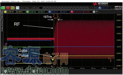 實測開啟時間如圖4所示。時間標度為每格500 ns,RF信號的上升時間小于200 ns。對于測量從柵極脈沖開始到RF脈沖上升沿結束的時間的系統,可以看到開啟時間約為300 ns,這說明系統分配1 μs用于發射到接收轉換會有相當可觀的裕量。