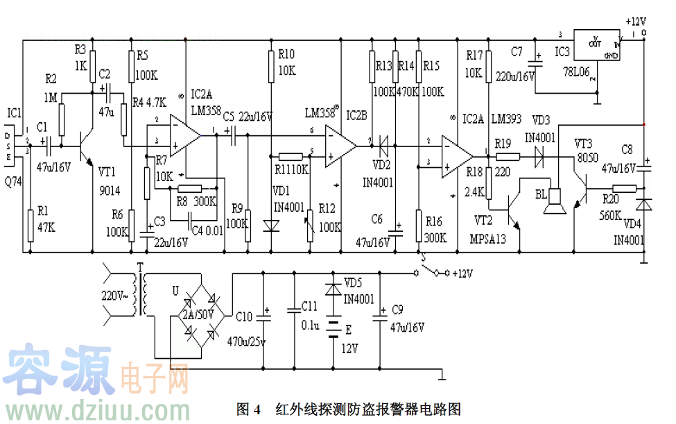 由VT3、R20、C8組成開機延時電路,時間也約為1分鐘,它的設置主要是防止使用者開機后立即報警,好讓使用者有足夠的時間離開監視現場,同時可防止停電后又來電時產生誤報。該裝置采用9-12V直流電源供電,由T降壓,全橋U整流,C10濾波,檢測電路采用IC5 78L06供電,交直流兩用,自動無間斷轉換。