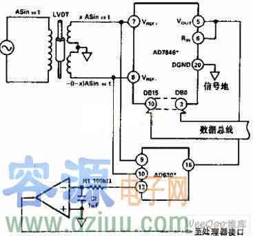 線性變換位傳感器(LVDT)位置測量電路 線性變換位傳感器(LVDT)位置測量電路的用途是用于位置測量和位移測量電路中的AD7846是LCMOS16位結構的DAC;LVDT是線性變換位移傳感器。AD630是同