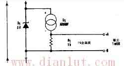 如圖所示為,一種用于測量4-20mA閉合回路中的功率而實際不影響火爐電流的溫度傳感器電路圖。這個特殊的溫度傳感器集成電路4D550F在用一個電壓范圍為4-40Vdc的電源供電時,會產生1μA/K的