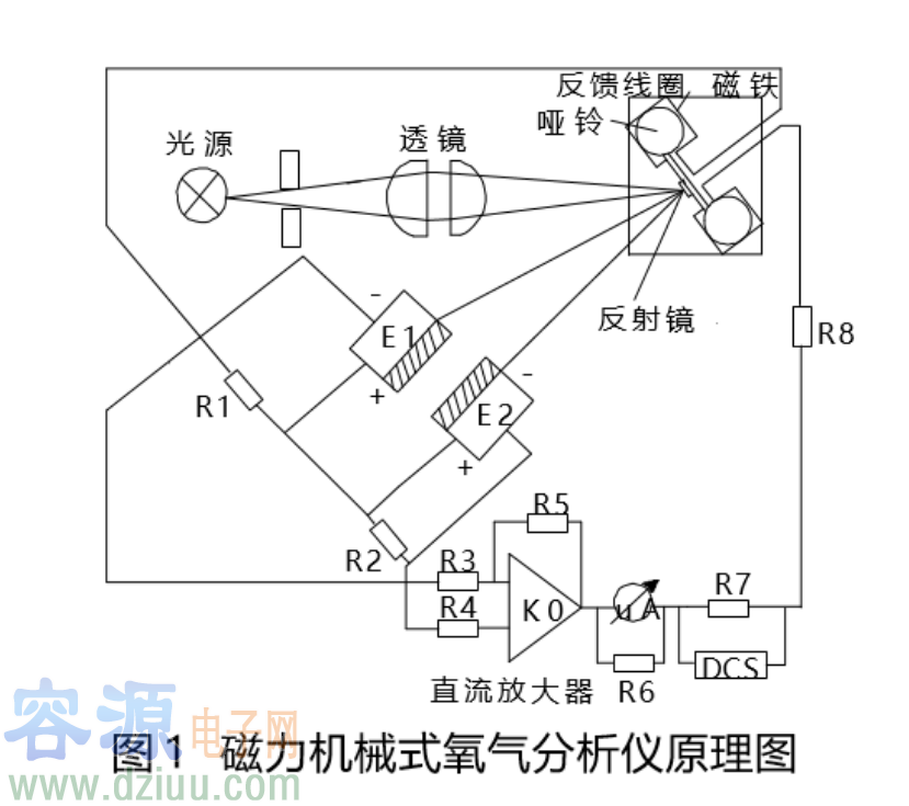 1.1磁機械式氧分析原理:由于氧氣分子具有較強的順磁性,氧氣分子會向著磁場增強的方向移動。通過兩種不同的氧含量氣體在磁場作用下所形成的的壓力差,并根據機械原理采用一根極為靈敏的鋼絲來懸吊啞鈴球,兩種不同的氧含量氣體在磁場中的壓力差會使偏移,而啞鈴球偏轉角度與混合氣體中含氧量濃度成正比,并由特定的光源、反射鏡以及感光原件所組成單元準確地測定出啞鈴球的偏轉角度,進而確定混合氣體中氧含量的百分比。