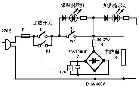 電源接通后,按下加熱開關K,電路接通,開始加熱。 整流C慮波后,給繼電器J供電,繼電器開關K1閉合;當加熱器加到設定值后,溫度開關WK斷開。繼電器J失電后,繼電器K1斷開,帶過電路處于斷開。從而達到節能的目的。 本文由m.flswjt.cn整理提供,部分內容來源于網絡,如有侵犯到你的權利請與我們聯系更正。