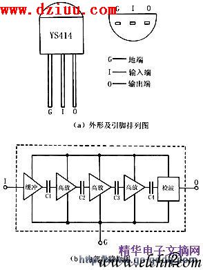 。各引腳功能:G腳為公共接地端,I腳為輸入端,O腳為輸出端。YS414型集成電路內部由9只三極管、16只電阻器和4個電容器組成,功能 一級高阻輸入緩沖、三級高頻放大和一級檢波,其內部電路框圖如圖2(b)