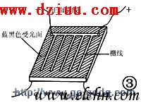 ,它的受光面呈藍黑色,上面有幾條銀白色的柵線,引出兩根導線 電池正極;背光面呈銀白色(鍍錫),引出兩根導線