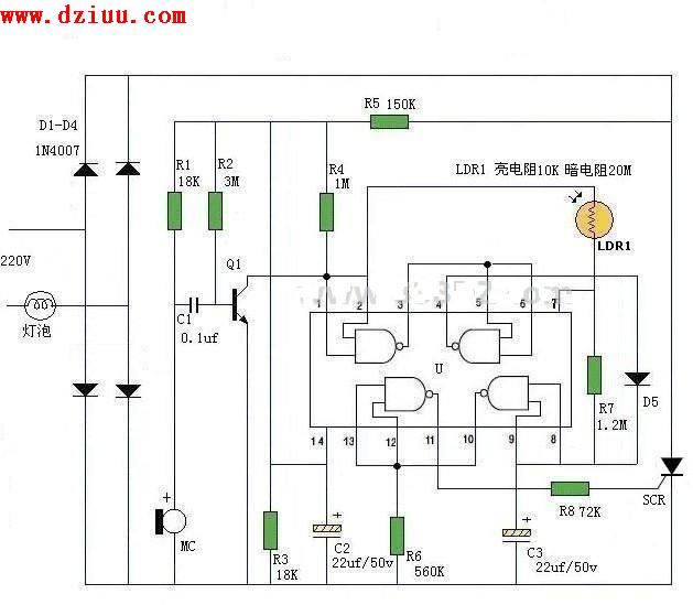集成塊了MC14011,LDR1用光敏電阻,電路圖如下:本文由m.flswjt.cn整理提供,部分內(nèi)容來源于網(wǎng)絡(luò),如有侵犯到你的權(quán)利請與我們聯(lián)系更正。