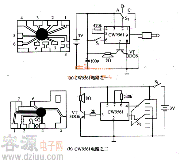 CW9561模擬聲集成電路是一種能發出警報聲、汽笛聲、警車聲及機槍聲的集成電路,它的典型應用電路如圖所示。在圖(a)所示電路中,當開關S2分別置于A、B、C位置,電路可分別發出報警聲、汽笛聲和警車聲;當S1開關閉