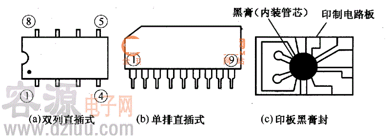 音樂集成電路的封裝形式基本有三種,即雙列直插式塑封,單排直插式塑封及印板黑膏封,如圖所示。 音樂集成電路的封裝形式 :