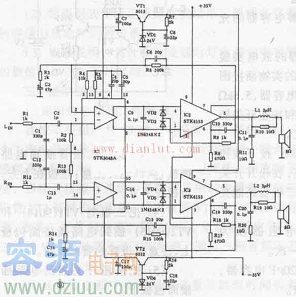 高保真功放集成電路sTK6153組成的2×100W功放電路示意