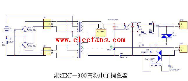 后級調試:將燈泡接于輸出端,檢查后級接線確認無誤后,觸通開關燈泡應亮,調電位器燈泡應明暗有變化,變壓器振蕩聲也會同時發生變化,粗略調試是將電位器調到低頻端能看到燈有閃爍感即可,如果進行細致調試,可在前級的直流輸入側接一直流電流表,調電位器使電流能在3A-10A范圍內變化即可,如電流不符合要求,可調整電阻R4的大小。本機調試時必須接負載,否則電路不會工作。下面提供一下電路原理圖: