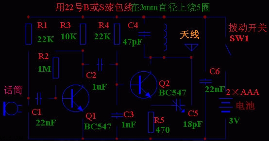 從圖(1)電路可見分兩級,一級音頻放大器和一級RF振蕩器。