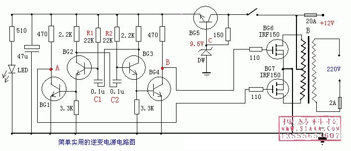 電容器 C1、C2用滌綸電容,三極管 BG1-BG5可以用9013:40V 0.1A 0.5W,BG6-BG7可以用場效應管IRF150:100V 40A 150W 0.055 歐姆。變壓器B的繞制請參考 逆變器的設(shè)計計算方法,業(yè)余條件下的調(diào)試;先不接功率管,測 A點、B點對地的電壓,