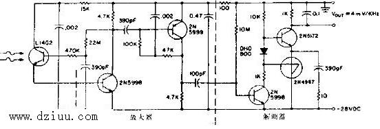 l14g2構成的檢測器,在由兩級放大器在加上一個頻率解調器組成。本電路最好應用在有自動增益控制的電路中應用,這樣才能得到較高的靈敏度。電路圖中標出了元器件的參數,有些元器件要根據實據