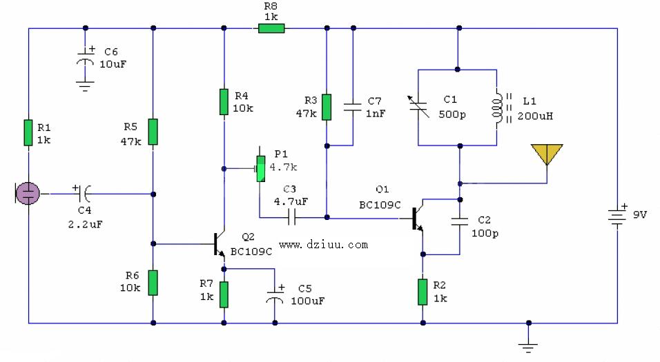 本電路采用9V供電,在市場就可以買到9V電池,很方便。電路元器件少,制作方便,調制簡單。元器件方便購買。發射的頻率根據調制功率大小可以在100~500M出實現接收(也 說,頻率可以發射100~500M)。發射的頻率接收方便,直接用收音機就可以接收。電路圖如下: