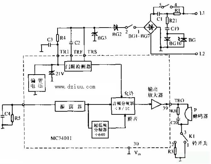 本電路只是普通電話機振鈴電路,電路的工作原理也很簡單,從,圖中可以看出,由L1和L2發來的載波信號,經橋式整流后送入MC3401的振鈴信號 電路,而39腳卻是蜂鳴器送出振鈴信息。蜂鳴器的音量控制也很簡單,