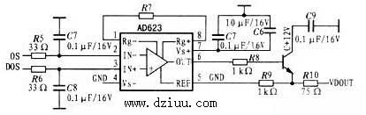 將視頻信號 補償輸出分別送至AD623的反相和同相輸入端.在AD623的輸出端接一級射極跟隨器以增強信號的驅動能力。選用該器件可消除采用普通運放和外圍電阻所引起的輸出信號的溫度漂移。