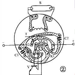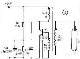 電原理圖如圖1 。接通電源時,電流通過電阻R1、線圈n2到三極管V的基極,使三極管V導通。