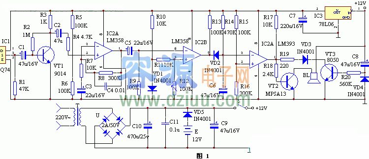 IC4的②腳變為低電平,它與IC4的③腳基準電壓進行比較,當它低于其基準電壓時,IC4的①腳變為高電平,VT2導通,訊響器BL通電發出報警聲。   <<版權聲明:本文由容源電子網(www_dziuu_com)整理提供,部分內容來源于網絡,如有侵犯到你的權利請與我們聯系更正。》