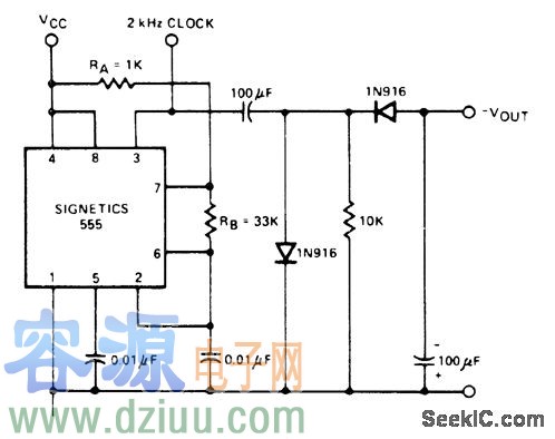 當(dāng)同時(shí)產(chǎn)生2兆赫的信號(hào),負(fù)輸出電壓線性追蹤直流輸入電壓的時(shí)候,該電路用于從正極電源電壓得出負(fù)極電源電壓,但是幅度是大約低于3V。電流不提供調(diào)節(jié)。—“賽格尼模擬數(shù)據(jù)手冊(cè)” 賽格尼公
