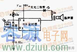 由555組成的感光式振蕩電路 如圖為由555組成的感光式振蕩電路。該電路用于探測閃電,可供盲人用作光雷達(dá)和報(bào)曉器等。555定時(shí)器的振蕩頻率隨光強(qiáng)度的增加而成正比例增加。當(dāng)它工作在自由振