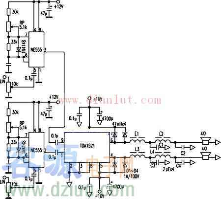 NE555與TDA1521共同組成的D類數(shù)字功放電路