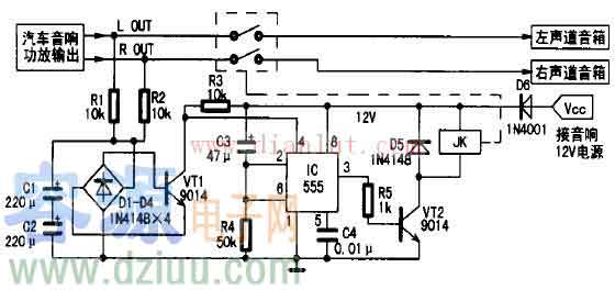 555制作汽車音響揚(yáng)聲器保護(hù)電路原理圖