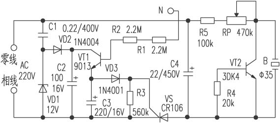 普通9013型等硅NPN三極管,VT2最好用3DK4型等硅開關三極管。VS要采用觸發電流較小的單向可控硅,如2N6565、CR106型等。C1要求采用耐壓400V