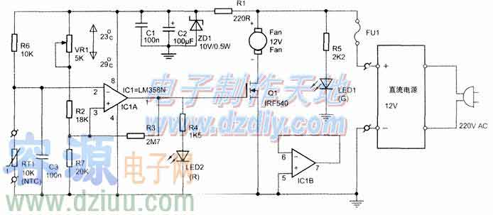 測溫電橋由溫度傳感器RT1與R6、VR1、R2、R7組成。IC1是一塊雙運放lm358N,在這里只用了其中一運放,接成帶滯后的電壓比較器。其同相輸入端加有VR1調(diào)定的基準電壓,調(diào)節(jié)VR1就可以在控溫范圍內(nèi)設定不同的溫度;反相輸入端則加有R6與RT1的分壓,由于RT1的阻值是隨被測環(huán)境溫度變化而改變的,因此ICIA反相端電位也隨溫度變化而改變。MOSFET管Q1在ICIA輸出電平(L≈0V,H≈10.5V)的控制下對負載散熱風扇Fan起電源開關作用。當水族箱水溫高于VR1的調(diào)定溫度值時,RT1阻值較小,R6和RT1分壓后使ICIA反相輸入端2腳的電位較低,此時ICIA的同相輸入端3腳電位大于反相輸入端電位,ICIA因而輸出高電平,使MOSFET管Q1飽和導通,負載散熱風扇Fan得電工作,對水族箱水降溫,同時LED2點亮,顯示負載Fan處于工作狀態(tài)。隨著水溫的下降,RT1的阻值逐漸增大,ICIA反相輸入端2腳的電位也隨之逐漸升高,當高于同相端基準電位時,ICIA即翻轉(zhuǎn)輸出低電平,Q1截止,負載Fan停止工作,同時LED2熄滅。以后,當水溫又將逐漸回升,當升至高于設定溫度時,又重復上述過程,如此周而復始使水族箱水溫保持在恒定值。