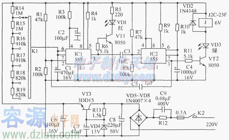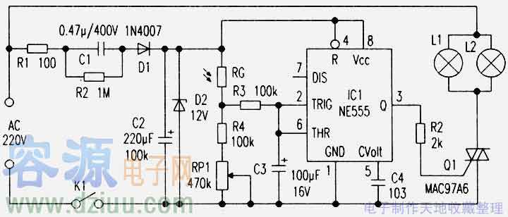 工作原理 電路原理如附圖所示,R1、R2、D1、D2,Cl、C2構成12V電源,為整機提供電源電壓,NE555及外圍元件組成帶延時的施密特觸發(fā)器,電路中RG為光敏電阻,用于檢測周圍環(huán)境的亮度。黃昏時,周圍環(huán)境的亮度逐漸變暗,RG的阻值也隨之變大,IC1的②、⑥腳電位逐漸降低,當電位小于1/3Vcc時,IC1的③腳輸出高電平,雙向可控硅Q1被觸發(fā)導通,燈籠中的燈得電被點亮。到了早晨,天空漸漸變亮,RG的阻值逐漸變小,IC1②、⑥腳的電位逐漸升高,當電位高于2/3Vcc時,③腳輸出低電平,Q1截止,燈籠中的燈熄滅。因NE555及外圍元件構成的施密特觸發(fā)器的回差電壓達1/3Vcc,所以在臨界亮度附近時,可以消除燈的閃爍發(fā)光現(xiàn)象。同時,為了避免節(jié)日的夜晚施放煙花、焰火時使周圍亮度發(fā)生急劇變化而使燈出現(xiàn)亮/滅閃爍現(xiàn)象,電路中特地加了延時電容C3。