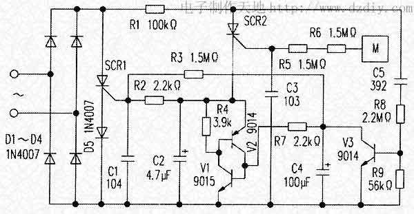 附圖所示電路可用于洗衣機或需要吸氣/排氣的風扇電機定時自動換向運轉電路。圖中虛線框內是電機M的電原理圖,C為裂相電容器,用作產(chǎn)生旋轉磁場使M轉動。L1、L2是參數(shù)完全相